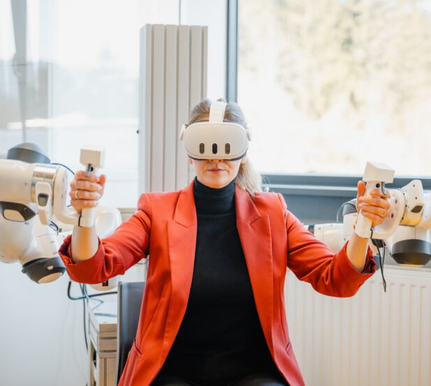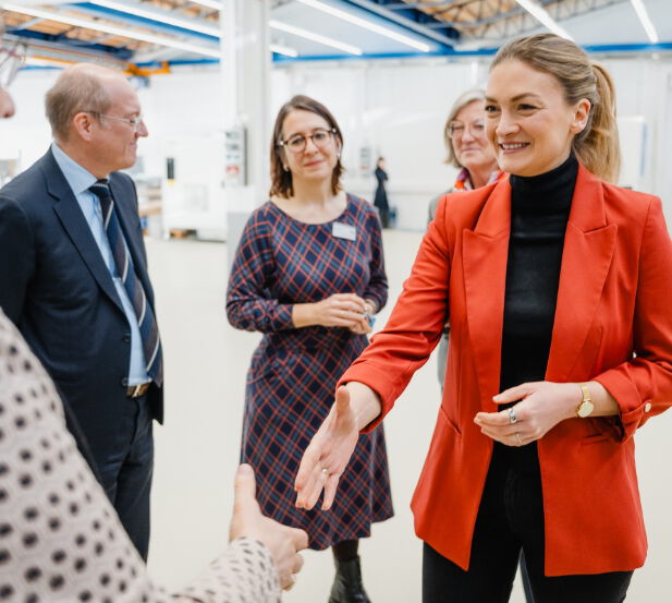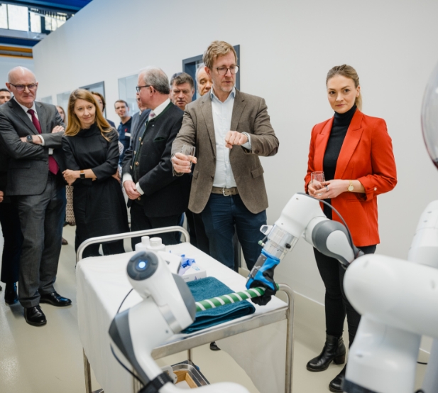 Ein besonderer Schwerpunkt des Besuchs lag auf praxisnahen Demonstrationen in den Testlaboren des Forschungszentrums: Assistenzroboter GARMI und sein erstmals vorgestellter Nachfolger GARMI 1.1 veranschaulichten, wie Technologie Pflege menschlicher macht. GARMI zeigte sein Potenzial zur Entlastung von Pflegekräften, etwa durch das sichere Navigieren eines Pflegewagens. Anwendungen wie diese schaffen Freiräume für das Pflegepersonal – Zeit, die unmittelbar den Menschen zugutekommt. Während GARMI auf Fragen von Nutzern bisher nur schriftlich auf einem Bildschirm antwortete, nutzt GARMI 1.1 nun eine Stimme und führt Gespräche. Ministerin Gerlach durfte die Steuerung eines Roboters selbst erproben – genauer gesagt die „Teleoperation” per Virtual Reality. Gerade für ältere Menschen in ländlichen Regionen ermöglicht diese Technologie medizinische, pflegerische und auch emotionale Unterstützung - unabhängig von Wohn- und Standort. Gerlach probierte dann ebenso eines der an der TUM entwickelten Exoskelette aus. Dies sind unterstützende Anzugsysteme, die sowohl Pflegepersonal als auch älteren Menschen im Alltag helfen, Kräfte zu sparen.